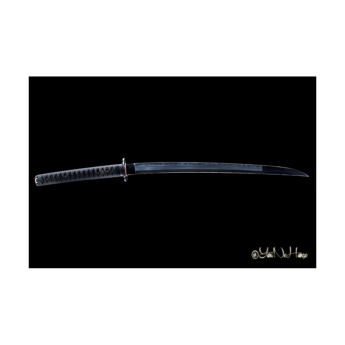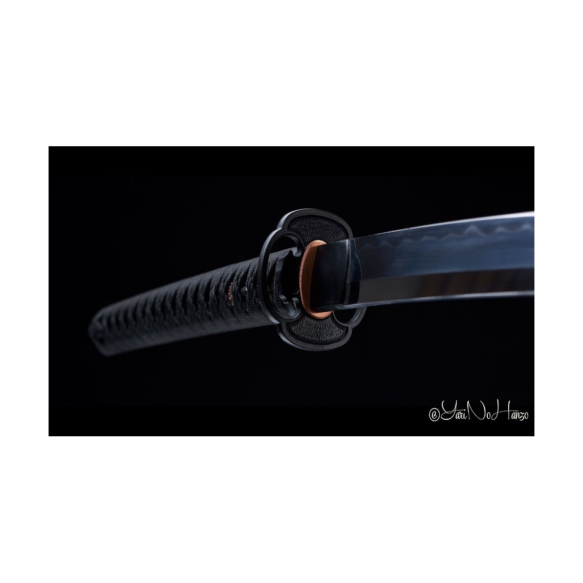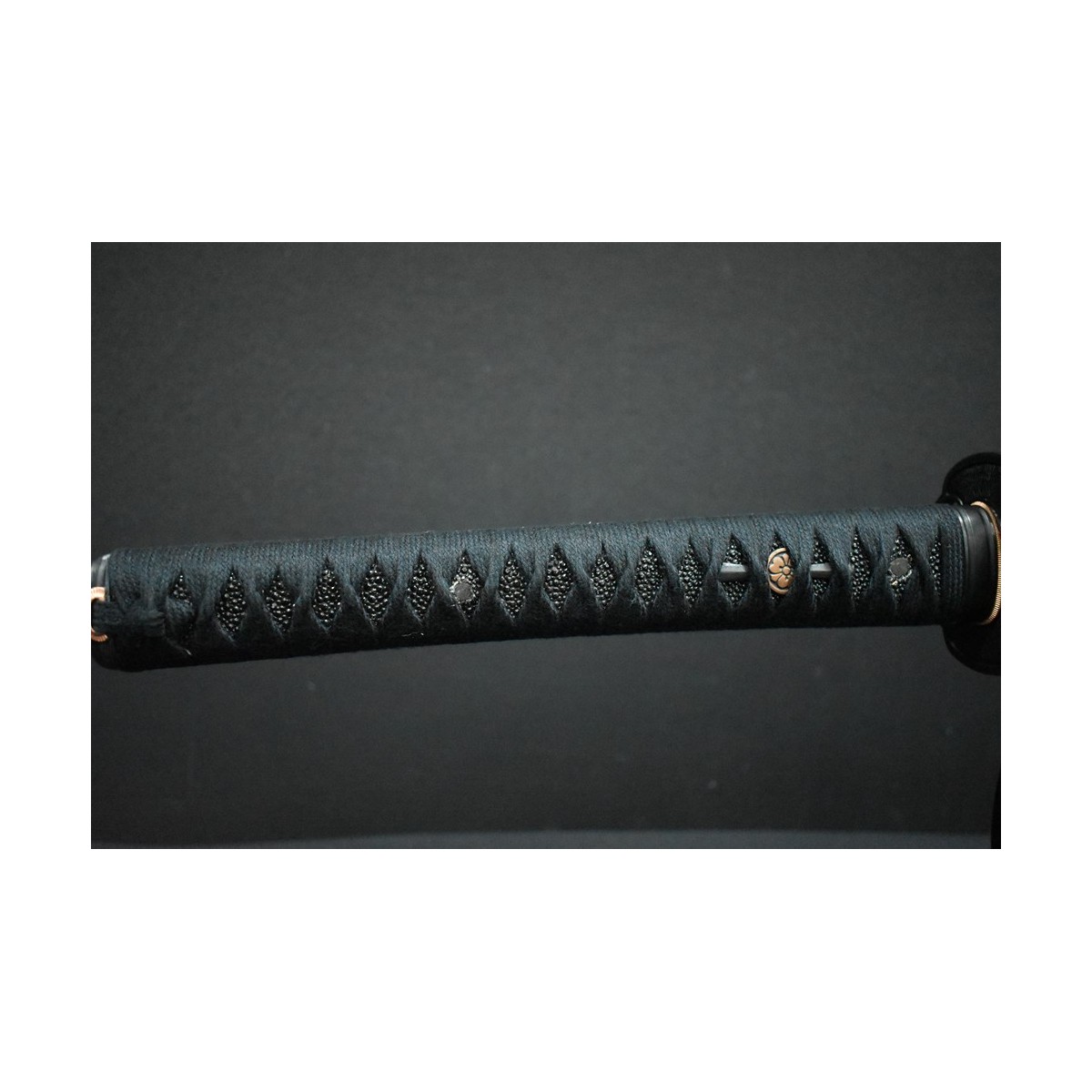 - Schwarzes Tsuka-Ito (Griffwicklung) aus Baumwolle und schwarze echte Rochenhaut.