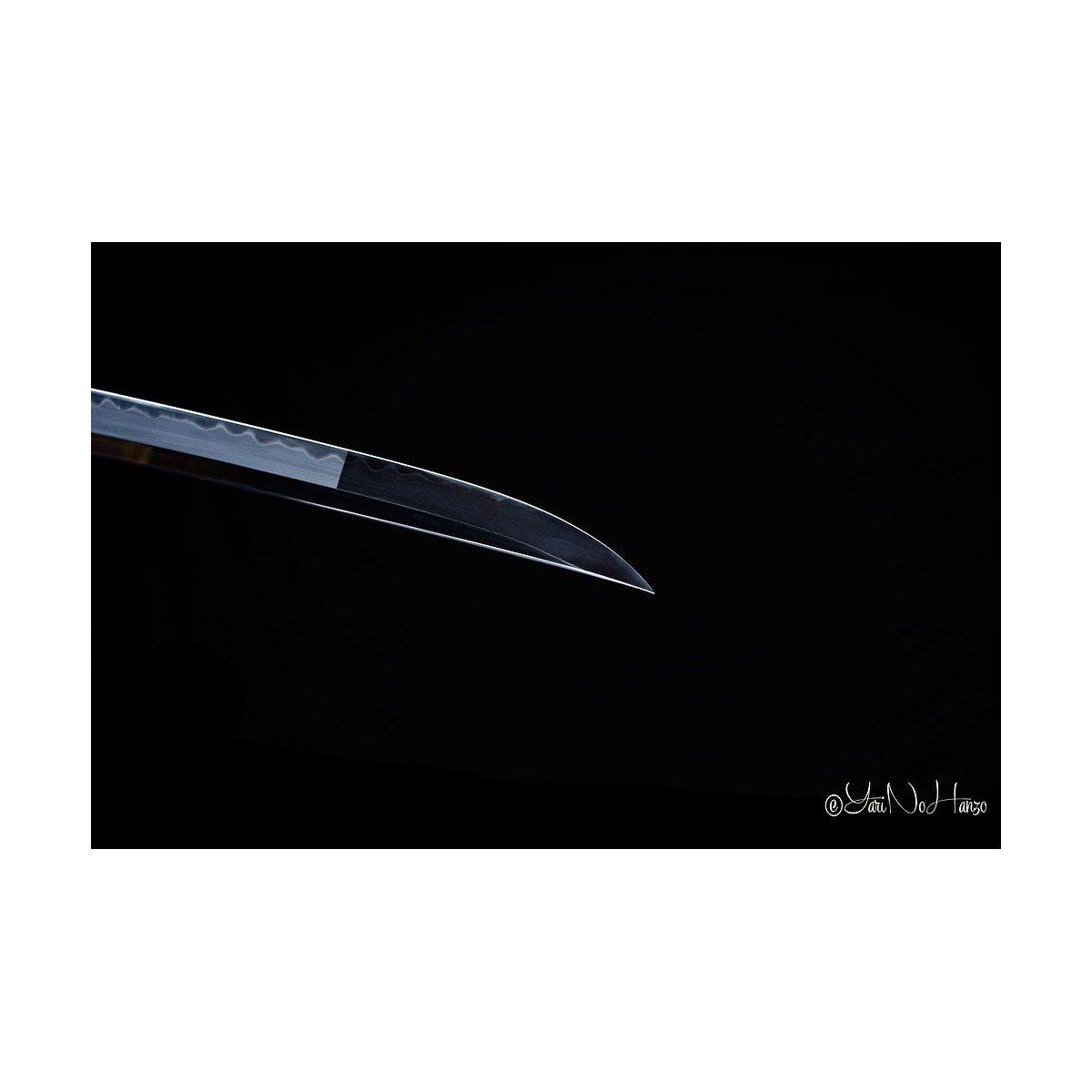 - Scharfe Maru-Kitae-Klinge ohne Bo-Hi (Kanal) mit Ō-Kissaki (大切先, „große Kissaki“) der Länge von 14 Cm., handgeschmiedet aus 1095 hoch kohlenstoffhaltigem Stahl, selektiven Härtung Ton und echte Gunome-Choji-Hamon (Begriffsklärung (Ha = Schneide, Mon = Muster)).