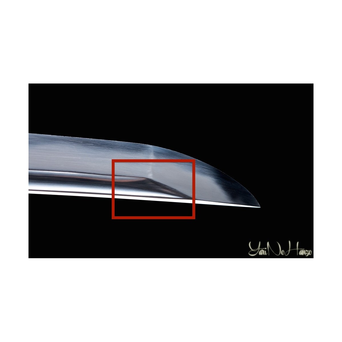 - Traditionelle Tsuka (Griff) mit Hishigami, dass eine bessere Griffigkeit und eine höhere Langlebigkeit des Tsuka-Maki (Stil/Muster/Art der Griffwicklung) garantiert.