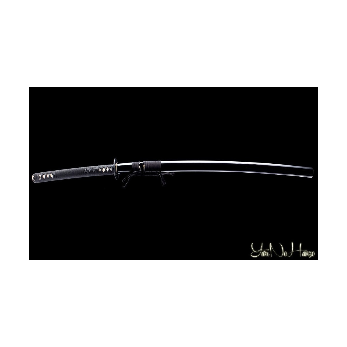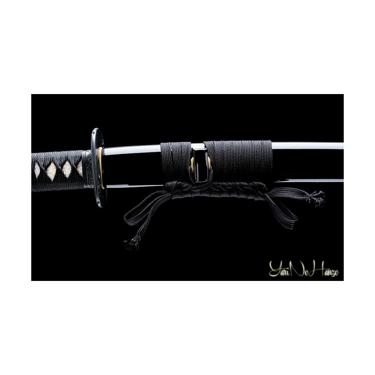 - Schwarzes Tsuka-Ito (Griffwicklung) und Tsuba cho-Hokei (Schwertstichblatt ) aus Eisen.