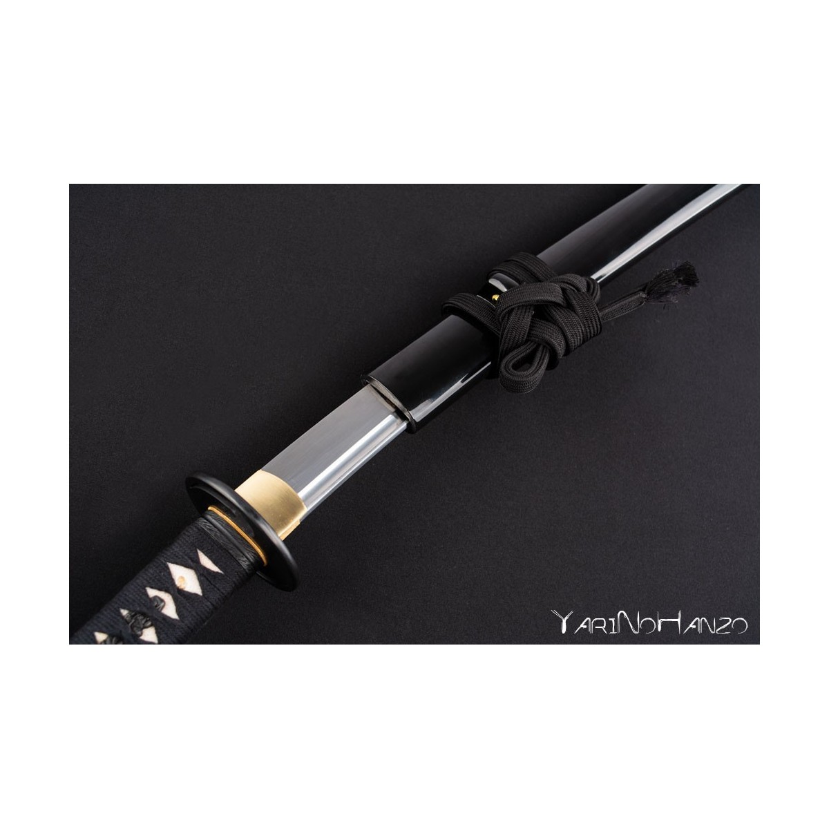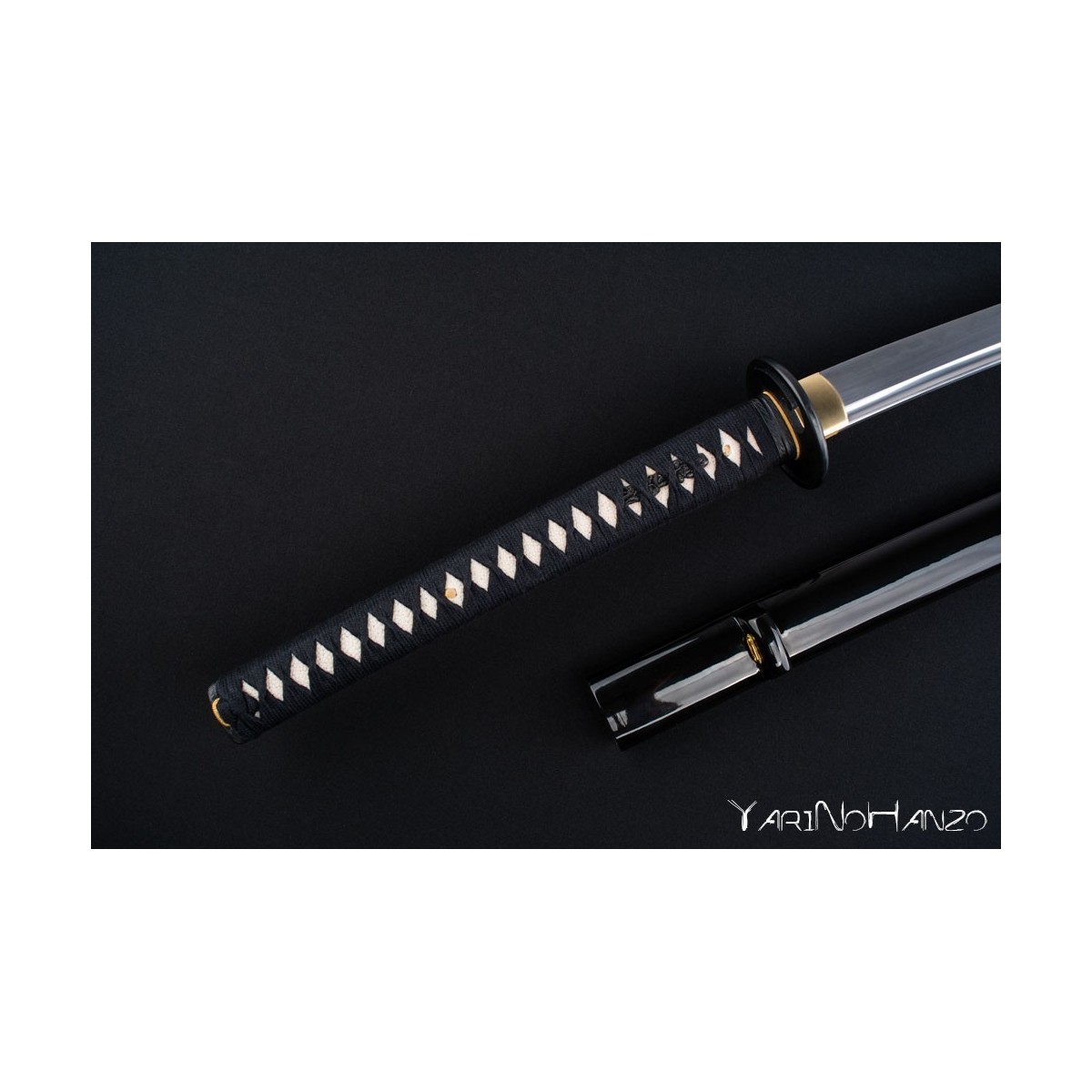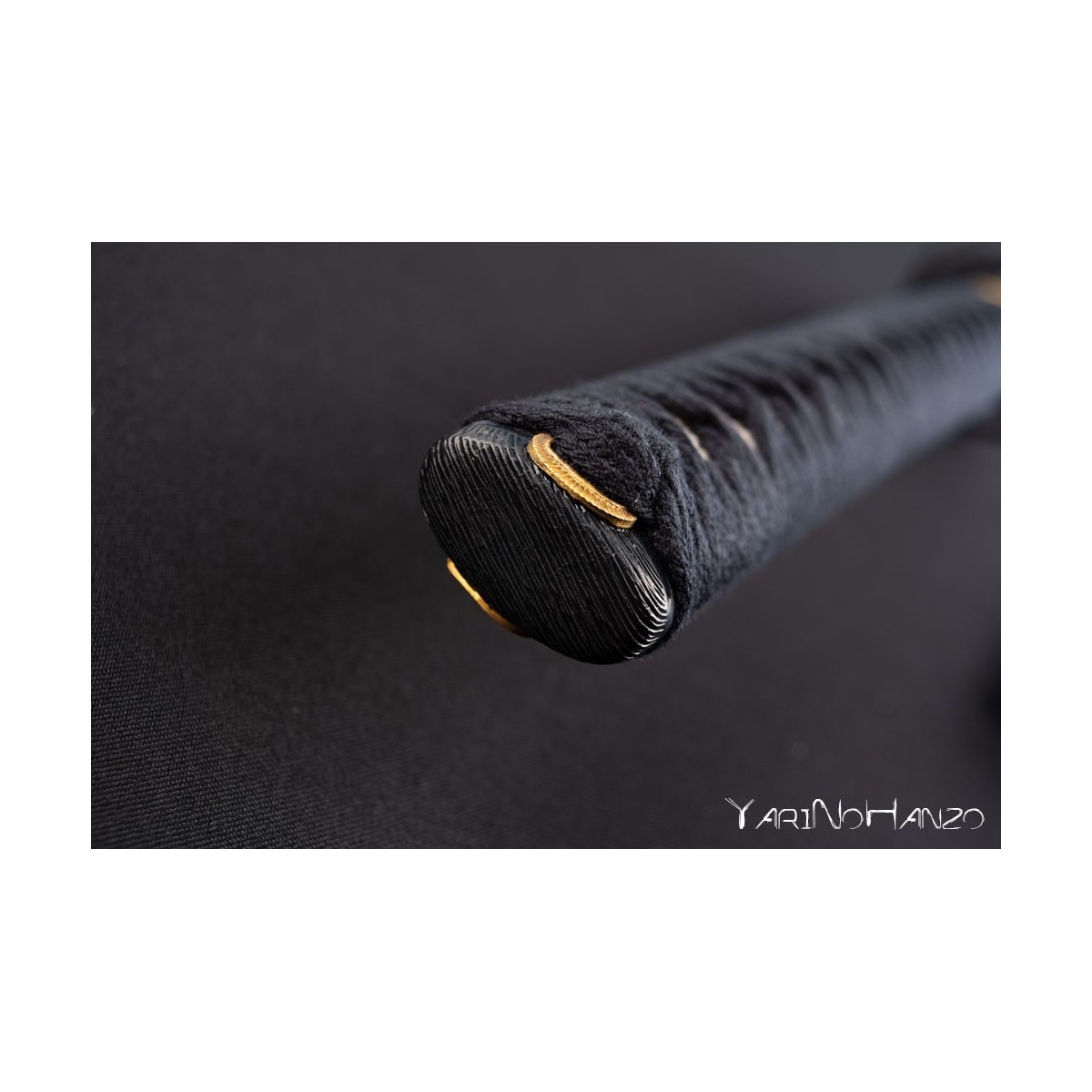 - Schwarzes Tsuka-Ito (Griffwicklung) und Tsuba Naga Marugata (Schwertstichblatt ) aus Eisen.