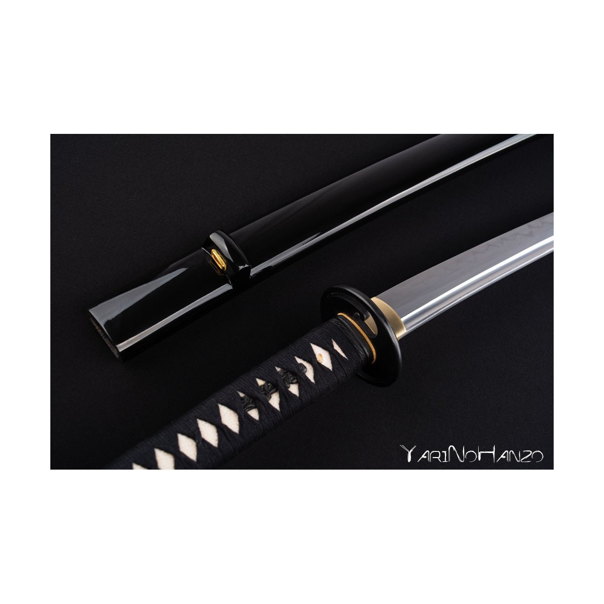 - Scharfe Maru-Kitae-Klinge mit Bo-Hi (Kanal) aus 1060 Kohlenstoffstahl-lehmbeschichtete Differentialhärtung 60/45 HRC.