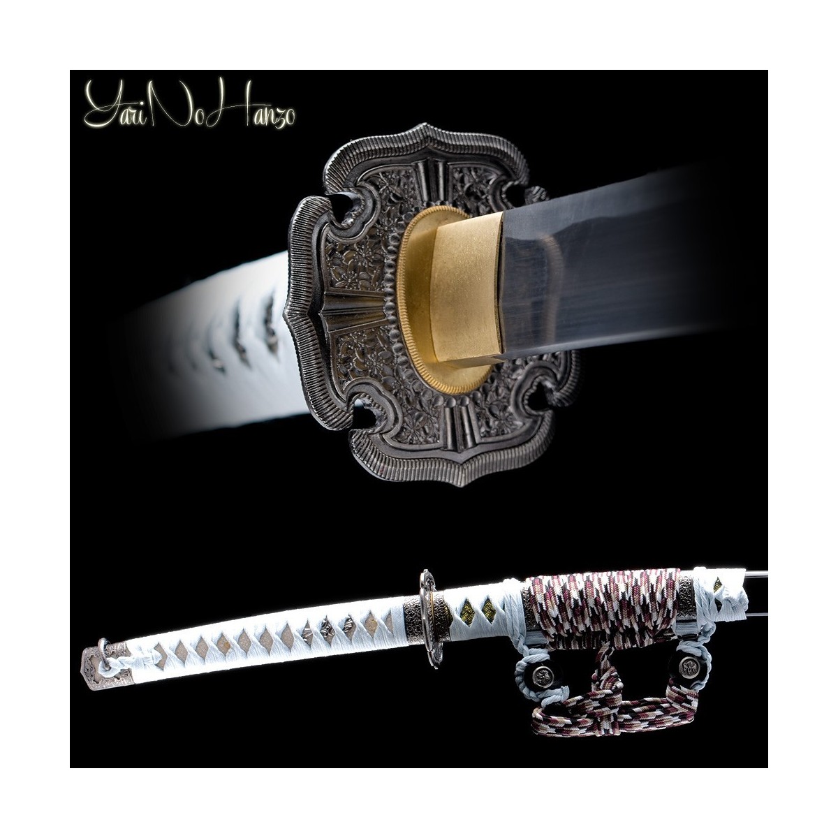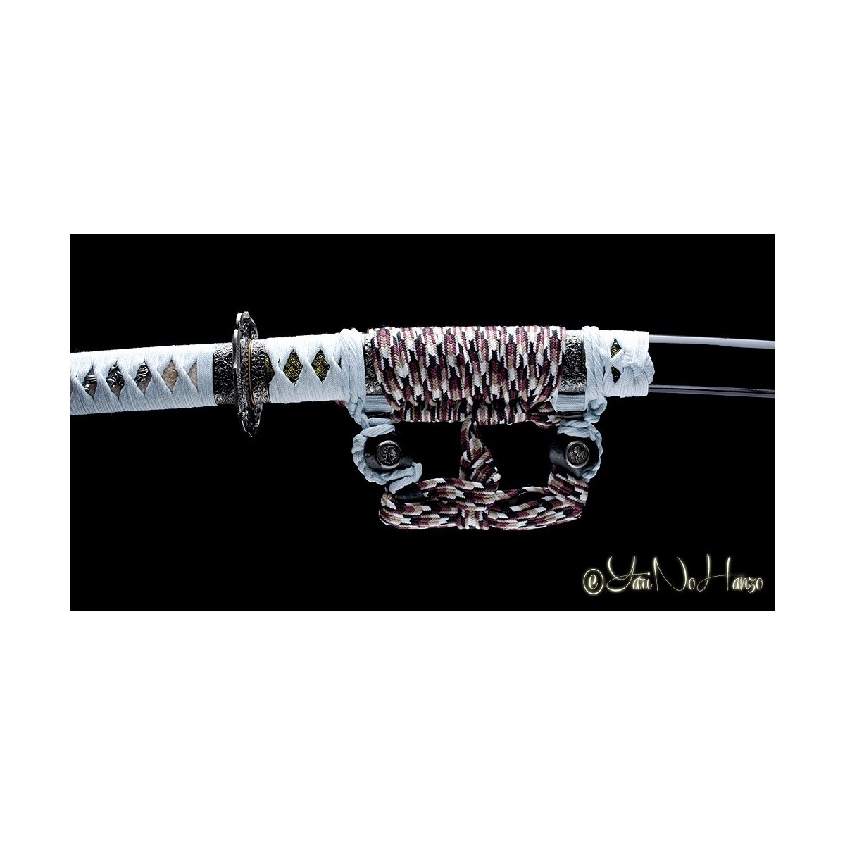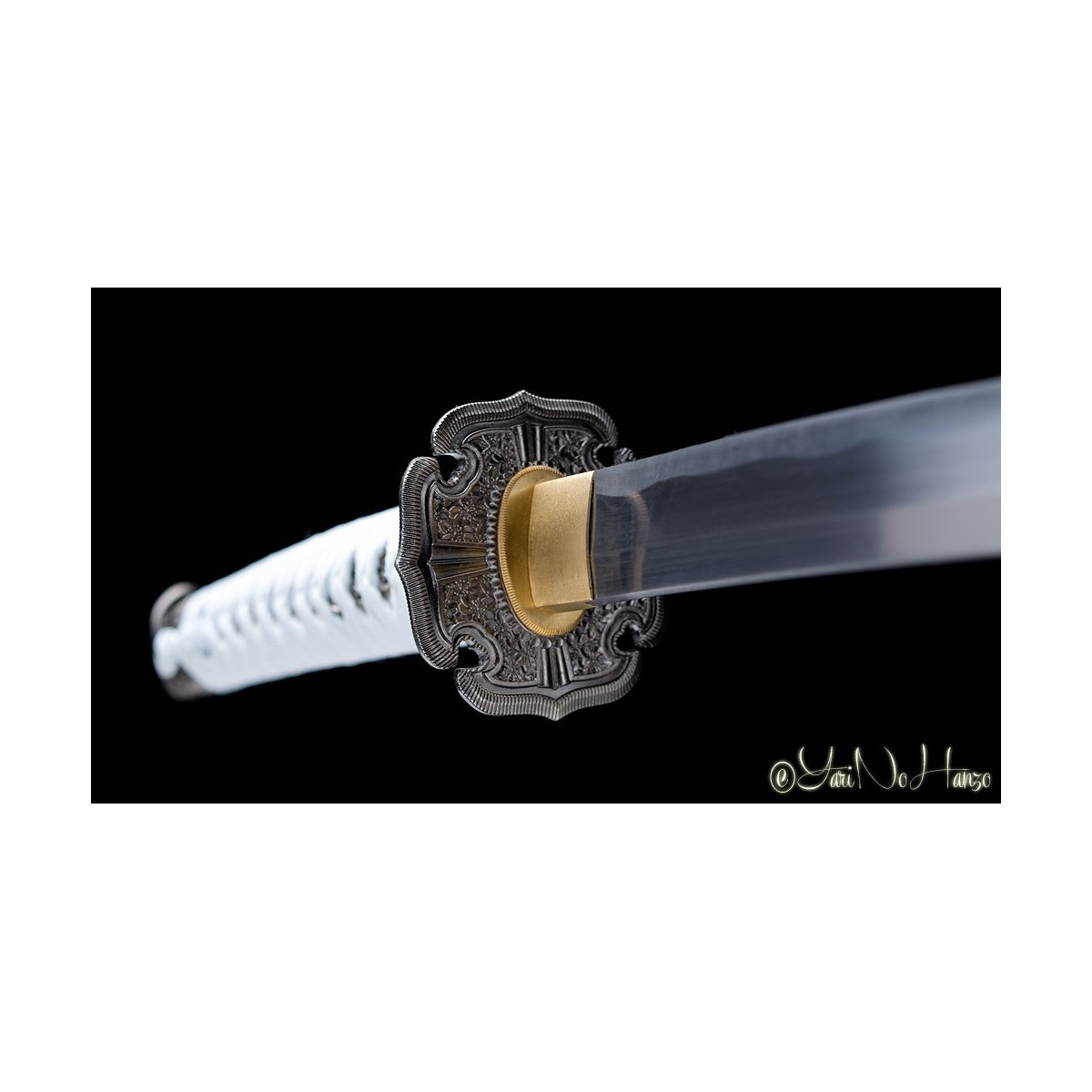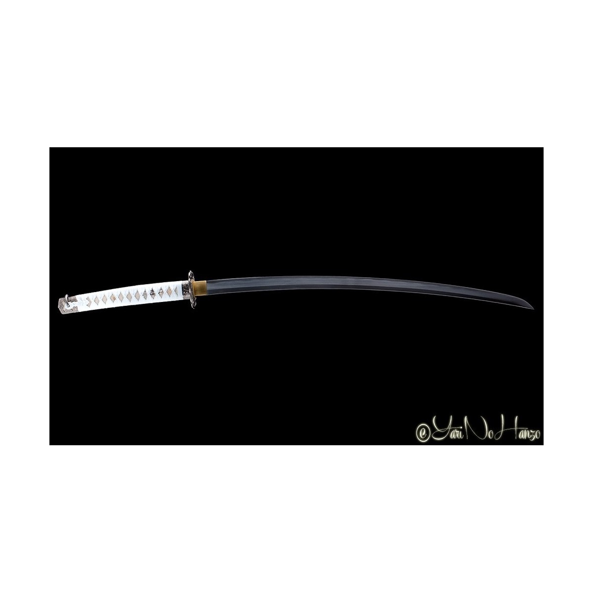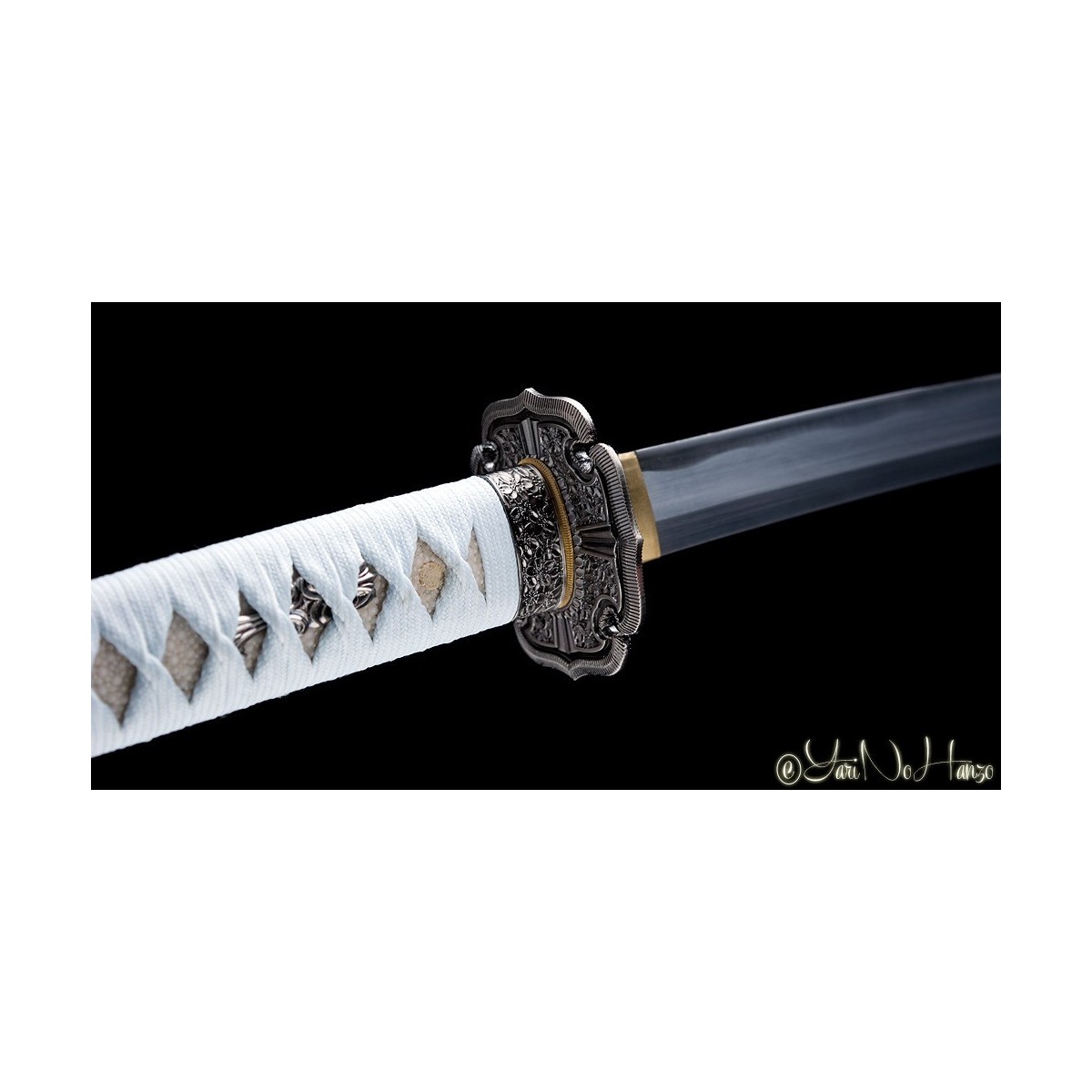 - Schwarze hochglanzlackierte Saya (Scheide) aus Holz, Ice-Graues Tsuka-Ito (Griffwicklung) mit echte Rochenhaut (Same).
