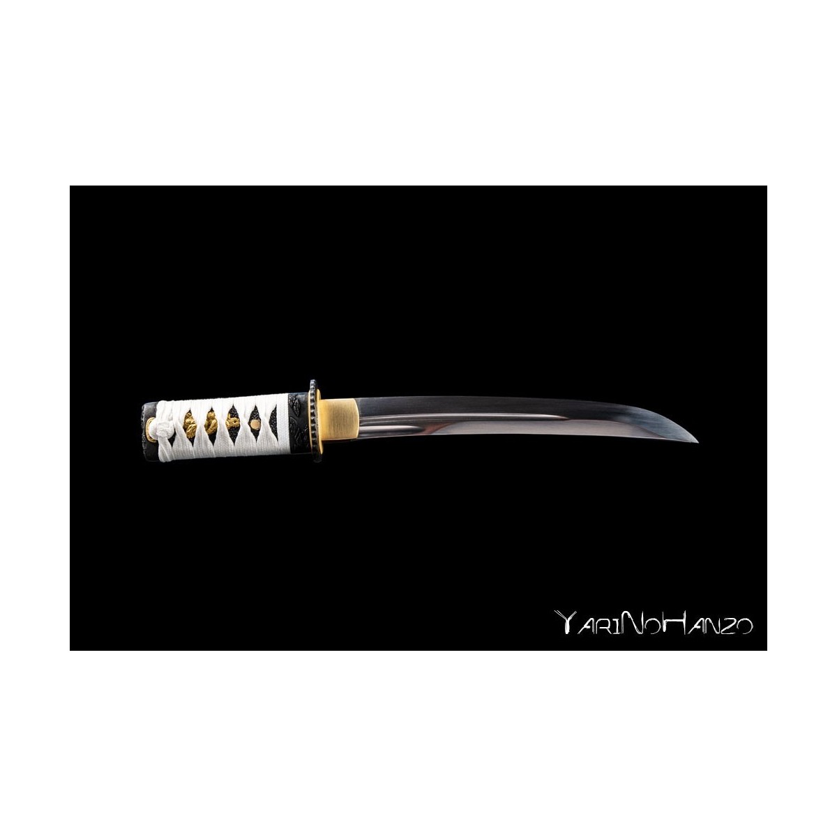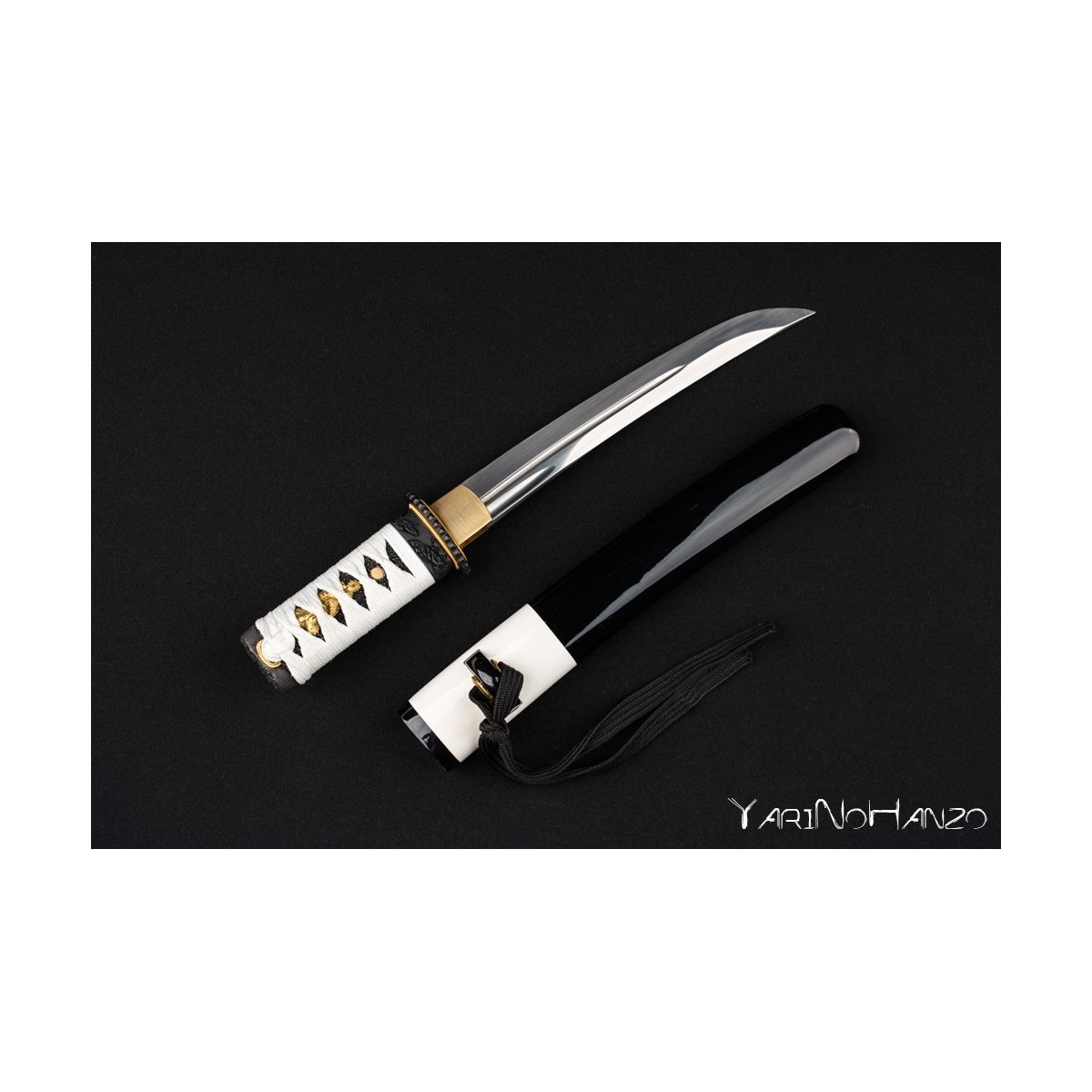 - Schwarz-weisse hochglanzlackierte Saya (Scheide) aus Holz, weisses Tsuka-Ito (Griffwicklung) mit schwarzer Rochenhaut (Same), Tsuba aus Eisen.