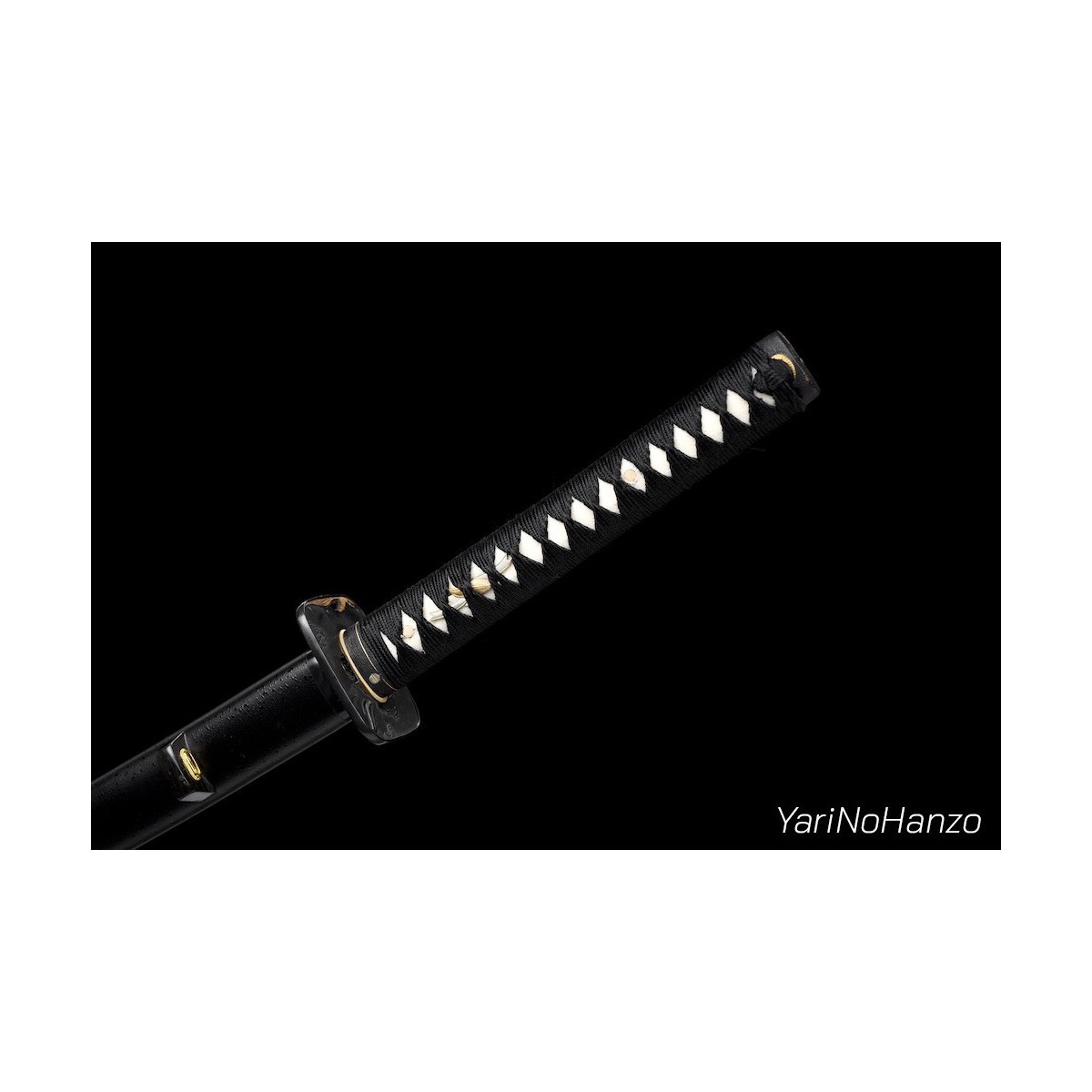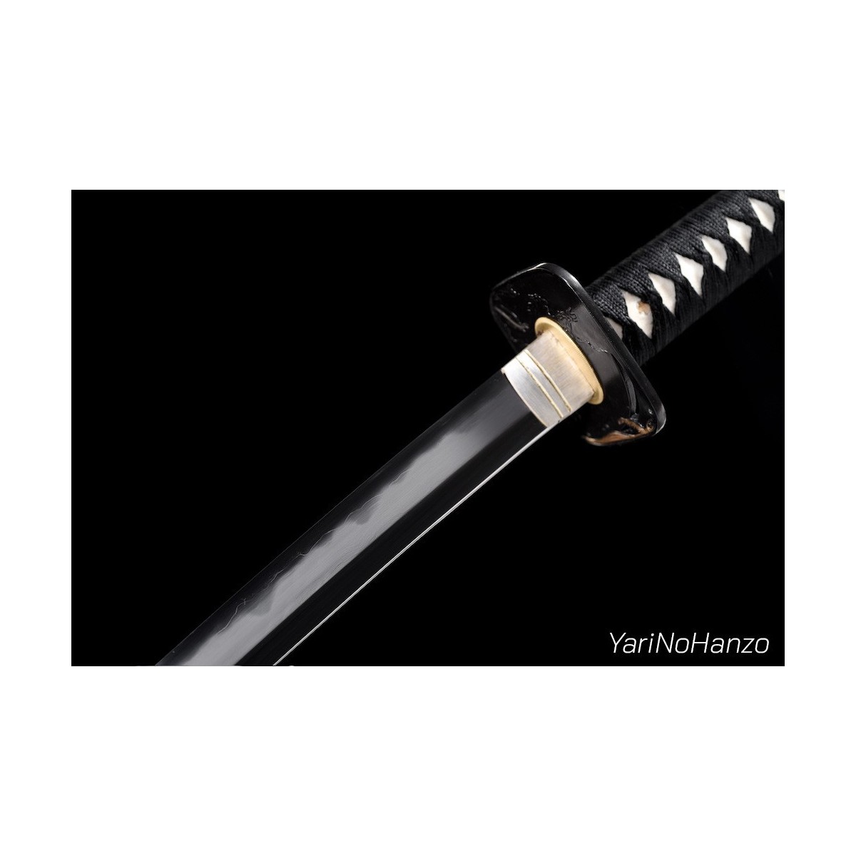 - Schwarze hochglanzlackierte Saya (Scheide) aus Holz mit traditionell angebrachter Griffumwicklung und Abschlüsse aus edlem Büffelhorn.