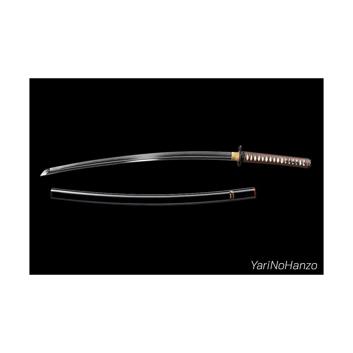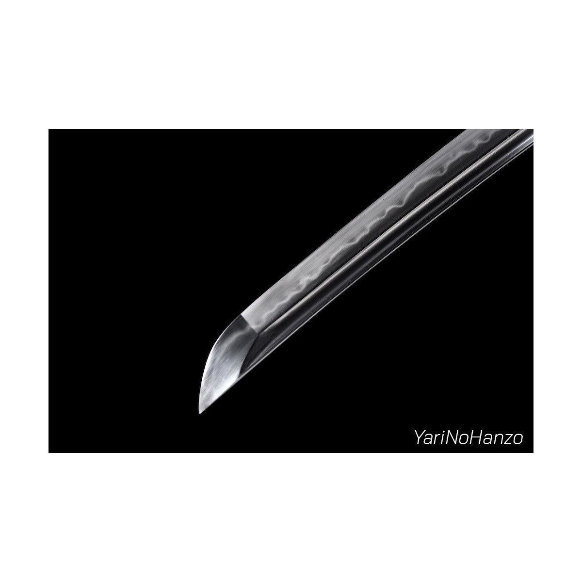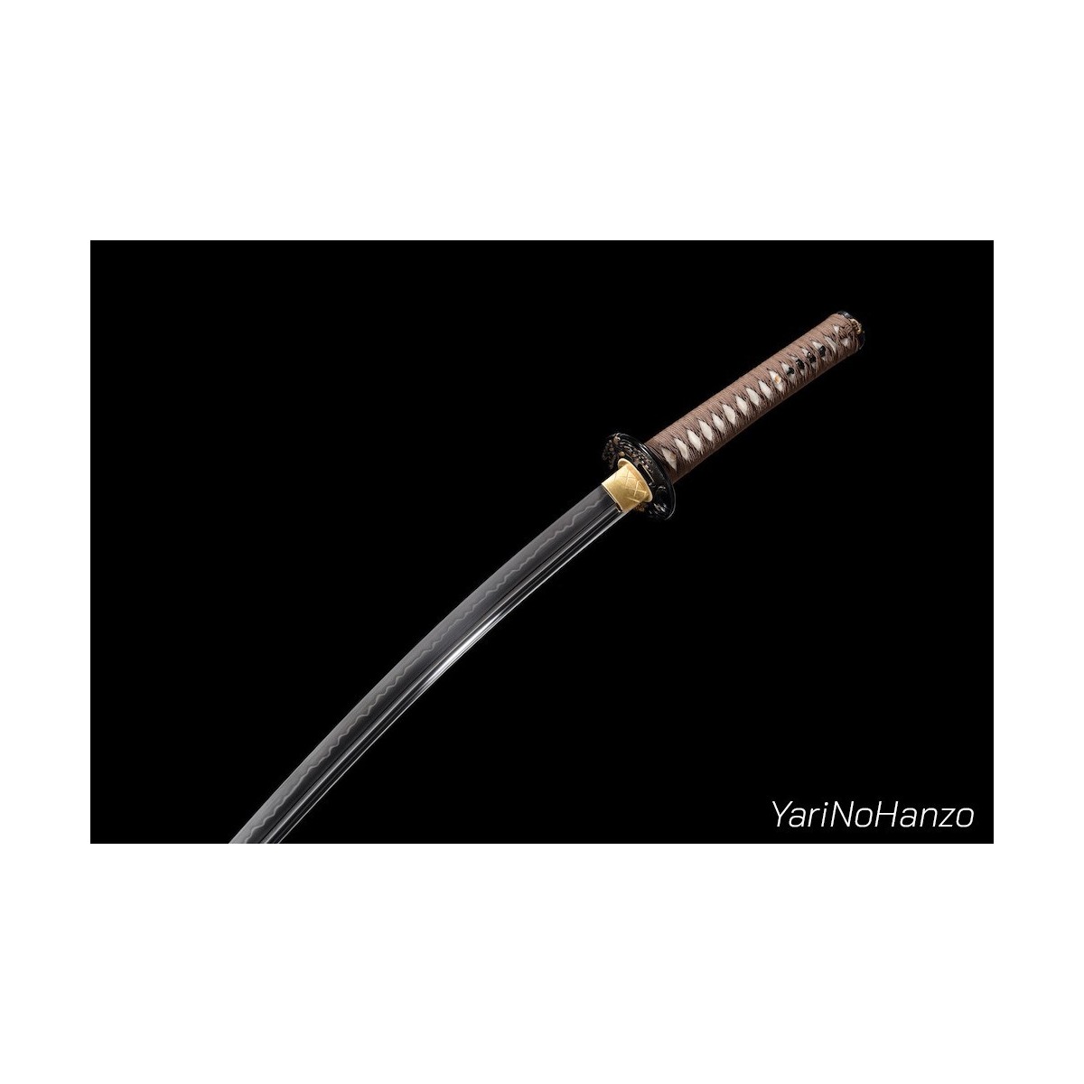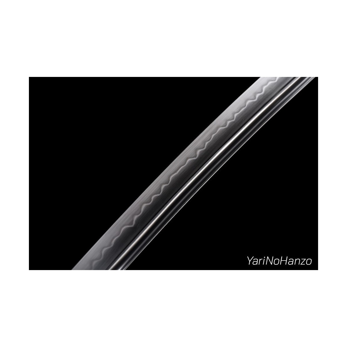 - Scharfe Maru-Kitae-Klinge mit Bo-Hi (Kanal) handgeschmiedet aus 1095 hoch kohlenstoffhaltigem Stahl, selektiven Härtung Ton und echte Gunome-Choji-Hamon (Begriffsklärung (Ha = Schneide, Mon = Muster)). Verbesserte Nakago mit Katte-Agari-Yasurime