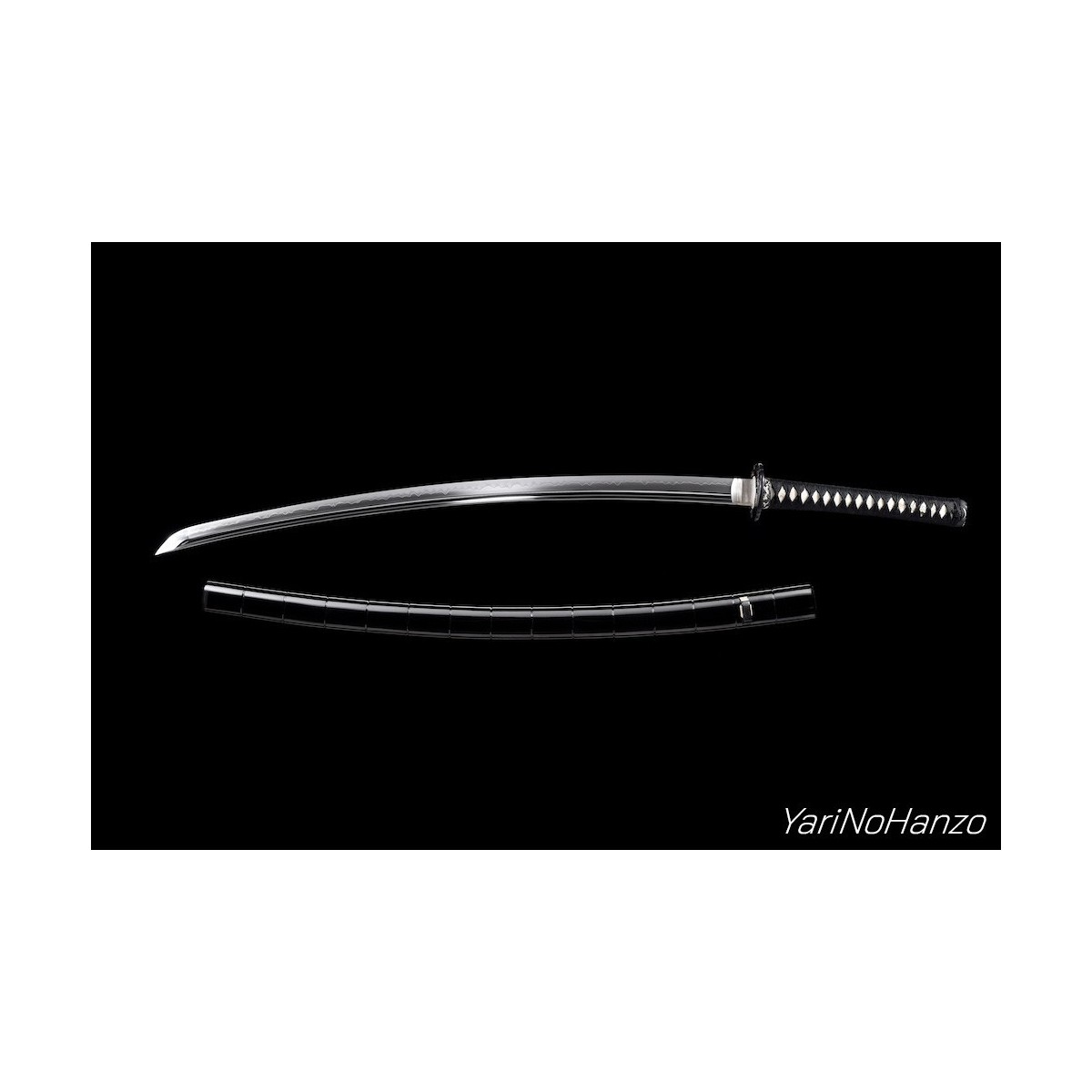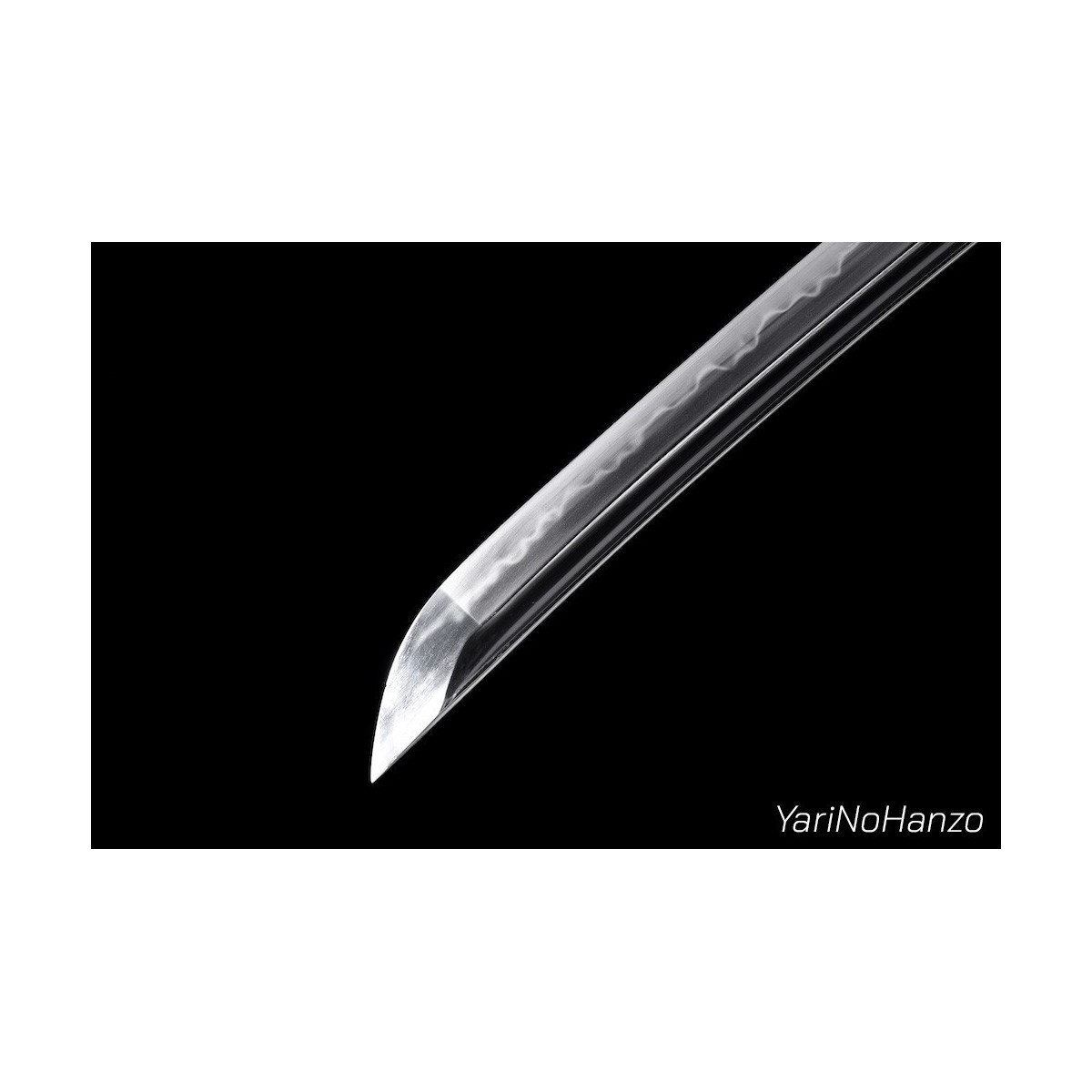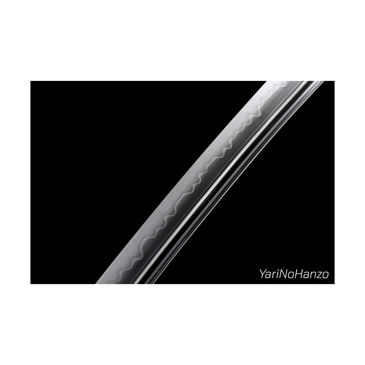 - Maru-Kitae-Klinge mit Bo-Hi (Kanal) handgeschmiedet aus 1095 hoch kohlenstoffhaltigem Stahl, selektiven Härtung Ton und echte Gunome-Choji-Hamon (Begriffsklärung (Ha = Schneide, Mon = Muster)). Verbesserte Nakago mit Katte-Agari-Yasurime