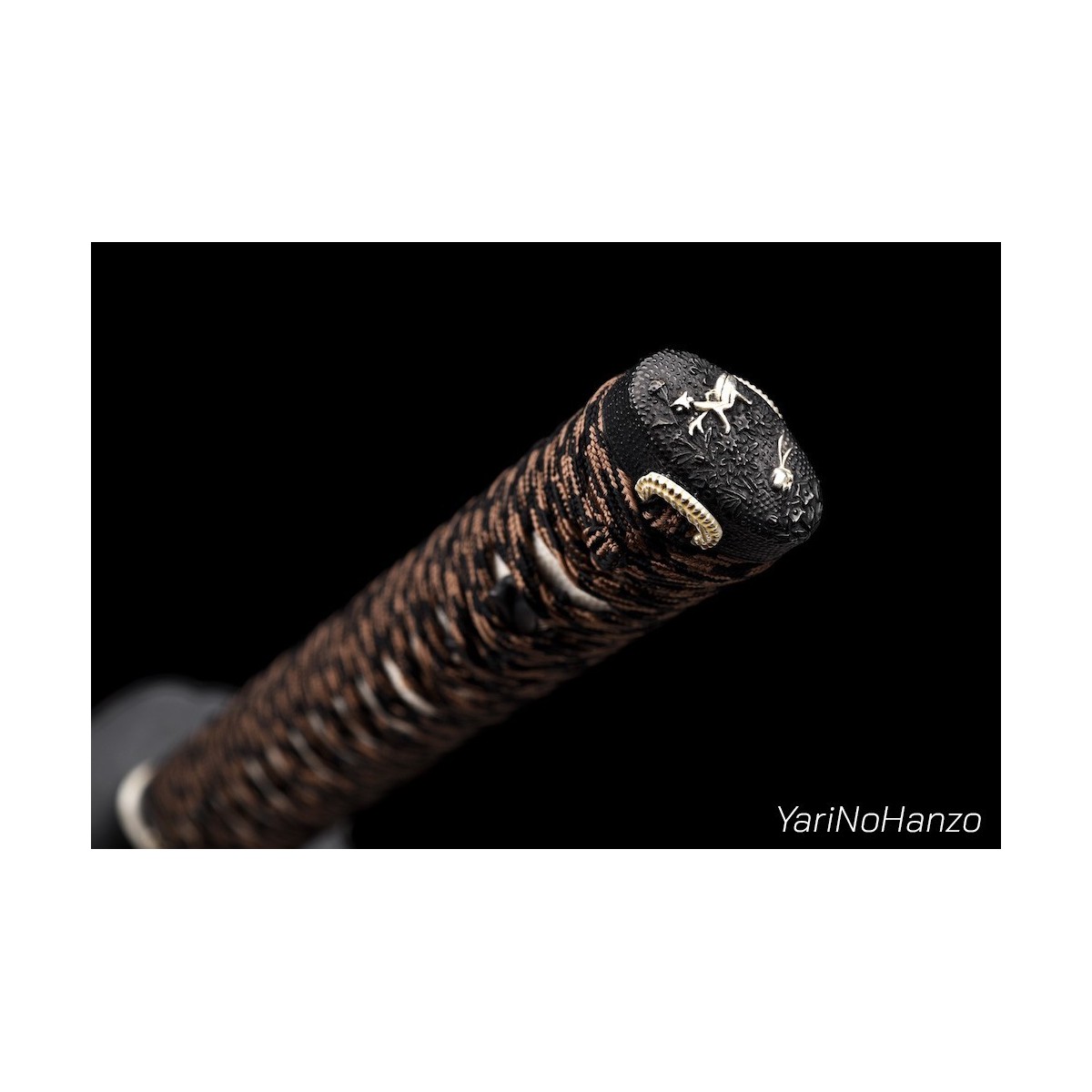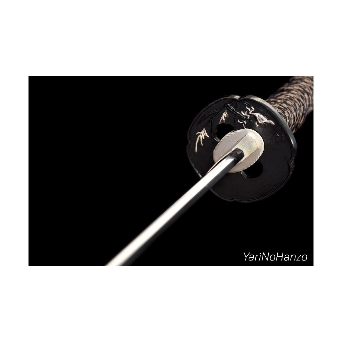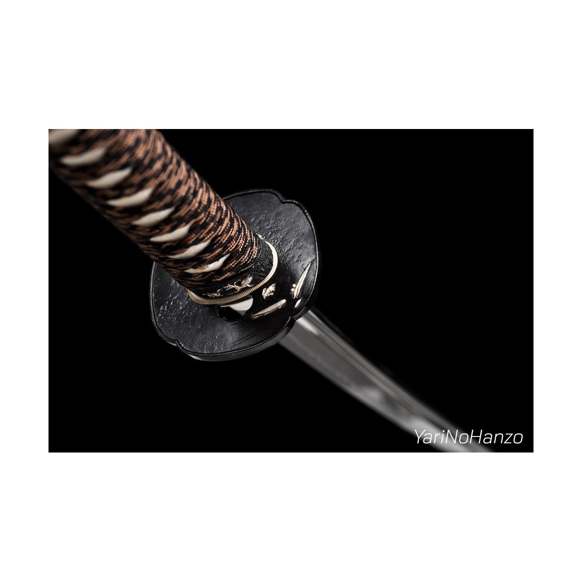 - Braunes- schwarzes Tsuka-Ito (Griffwicklung) aus Seide und traditionelle Mokko-Tsuba (Schwertstichblatt).