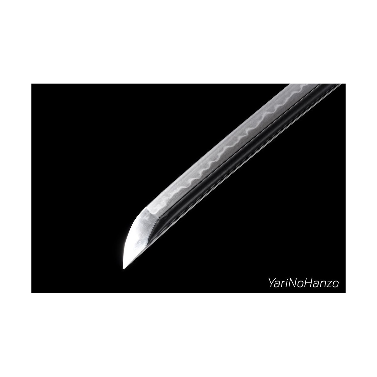 - Maru-Kitae-Klinge mit Bo-Hi (Kanal) handgeschmiedet aus 1095 hoch kohlenstoffhaltigem Stahl, selektiven Härtung Ton und echte Gunome-Choji-Hamon (Begriffsklärung (Ha = Schneide, Mon = Muster)). Verbesserte Nakago mit Katte-Agari-Yasurime