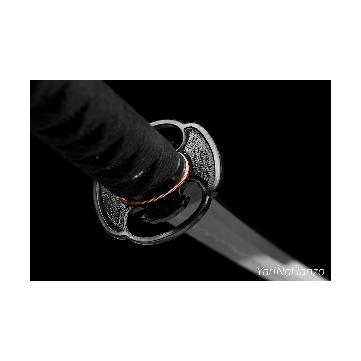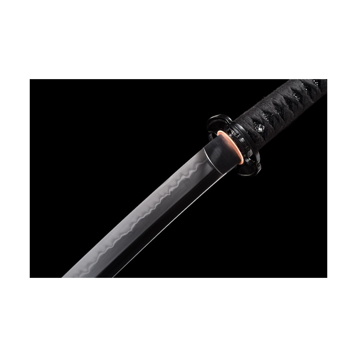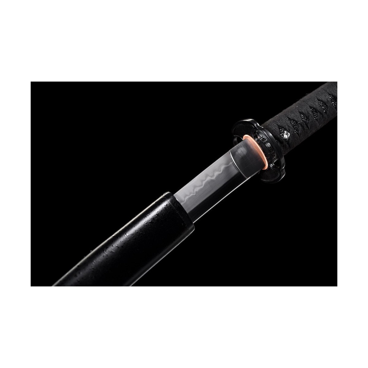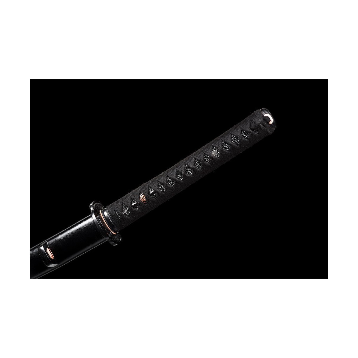 - Schwarzes Tsuka-Ito (Griffwicklung) aus Baumwolle und schwarze echte Rochenhaut.