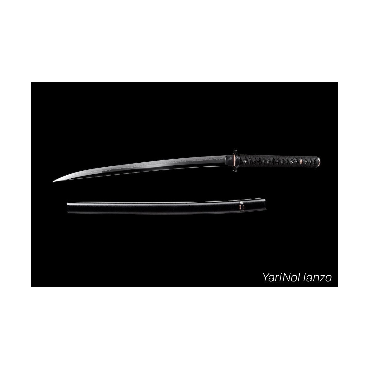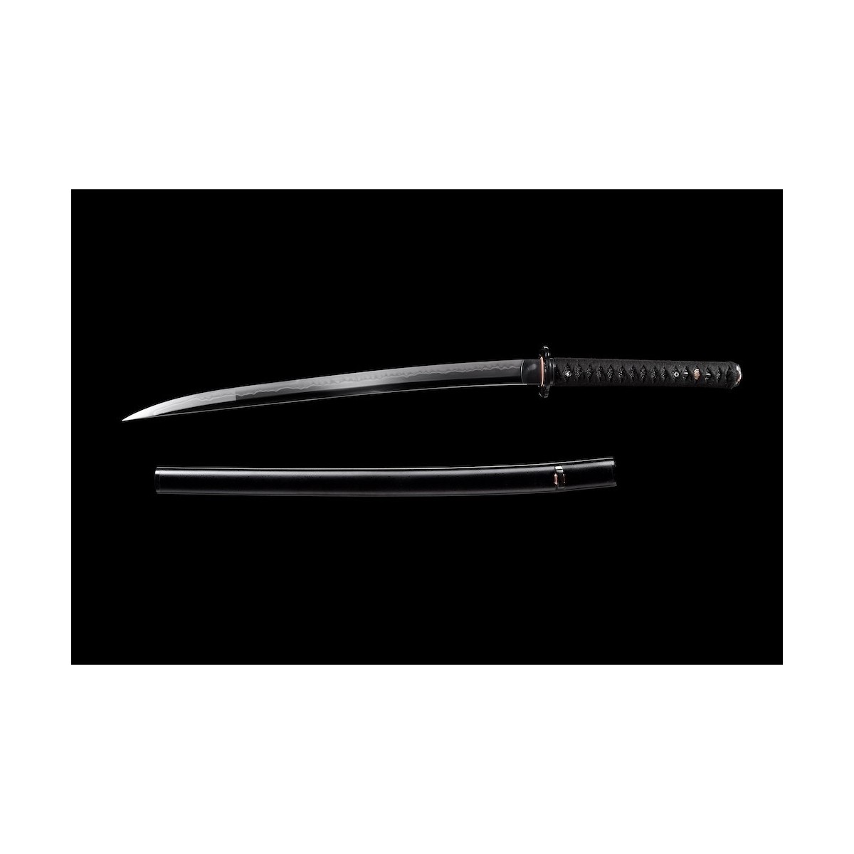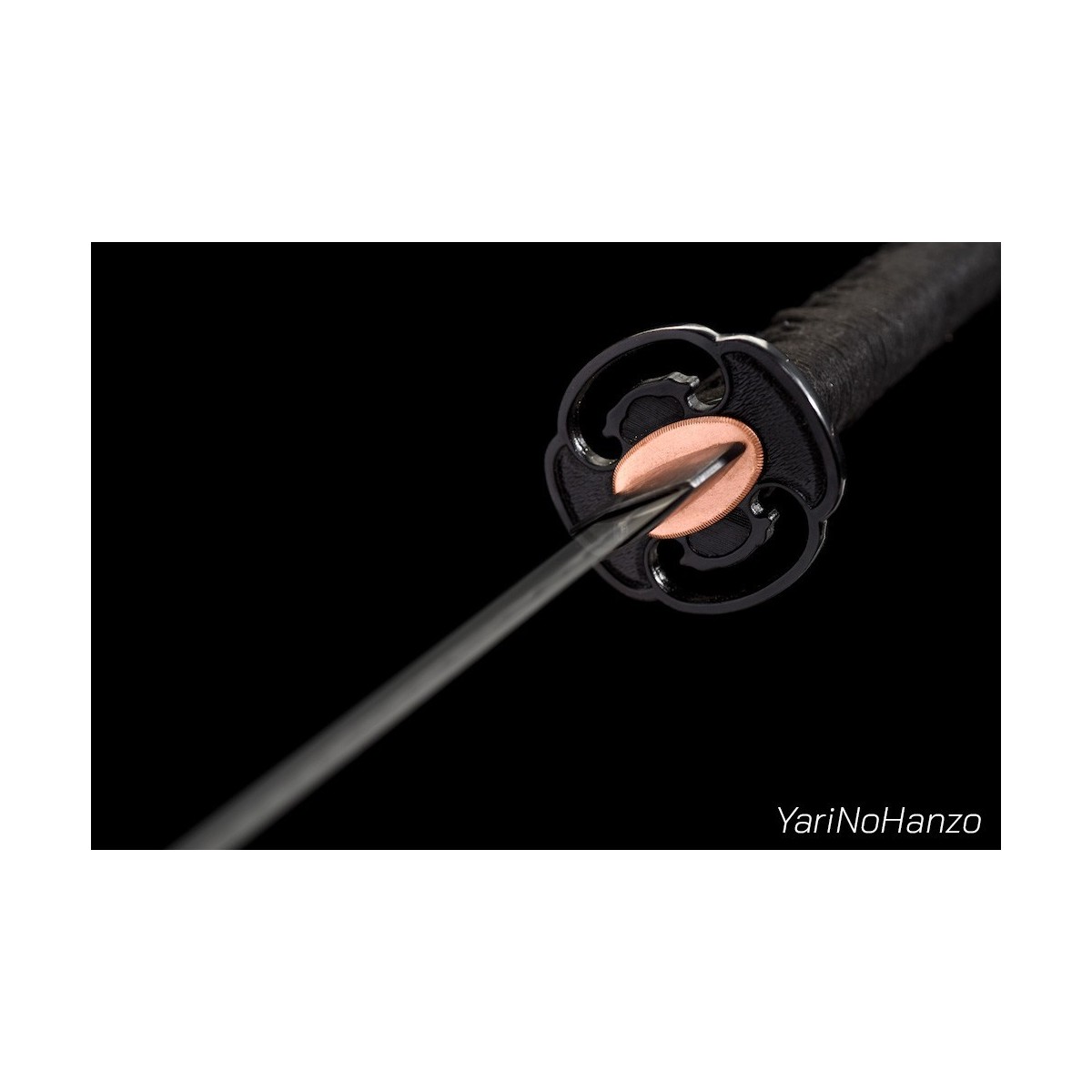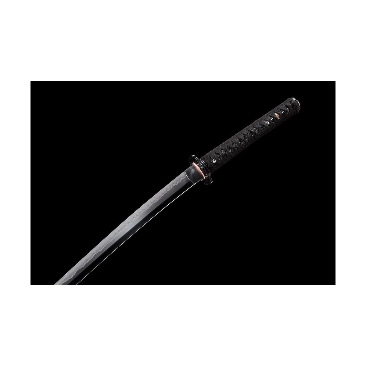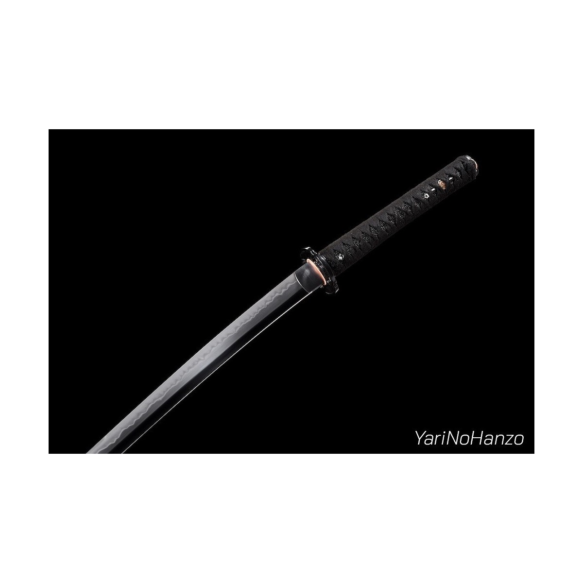- Schwarzes Tsuka-Ito (Griffwicklung) aus Baumwolle und schwarze echte Rochenhaut.