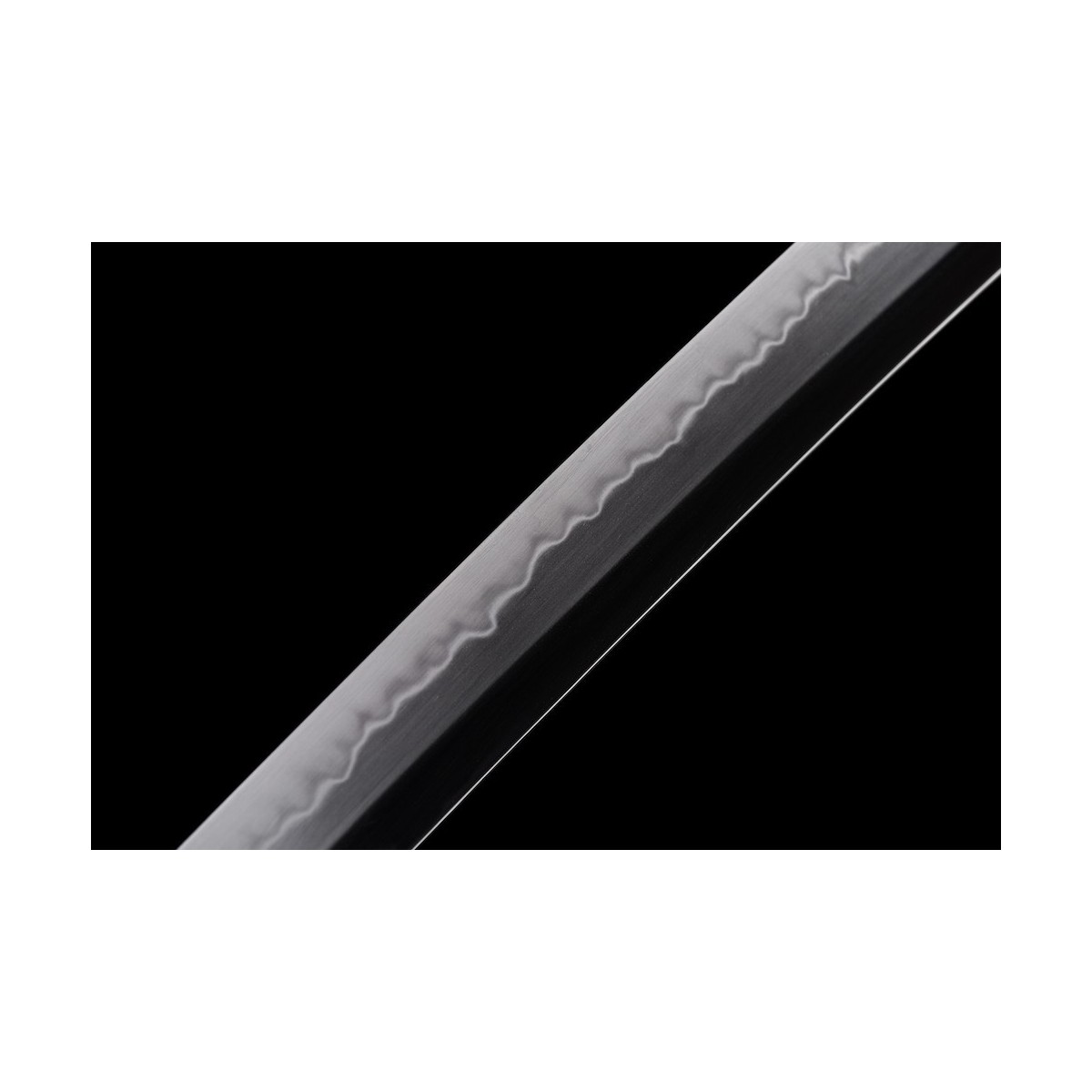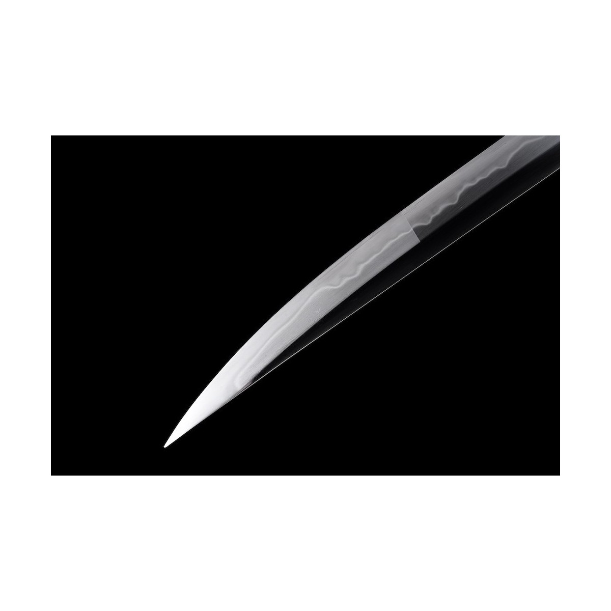 - Scharfe Maru-Kitae-Klinge ohne Bo-Hi (Kanal) mit Ō-Kissaki (大切先, „große Kissaki“) der Länge von 14 Cm., handgeschmiedet aus T-10 Stahl, selektiven Härtung Ton und echte Gunome-Choji-Hamon (Begriffsklärung (Ha = Schneide, Mon = Muster)).